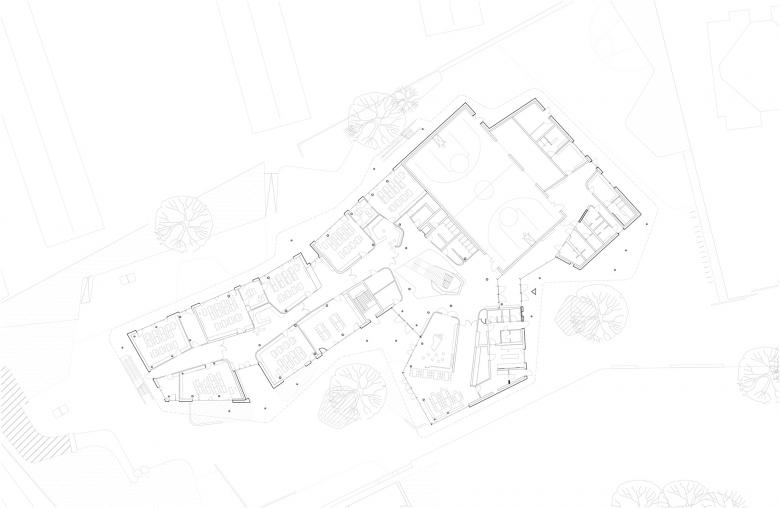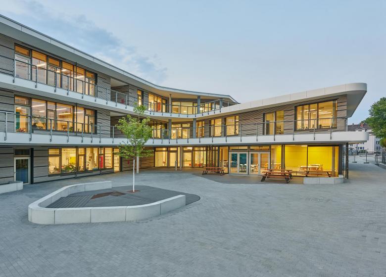 The building is surrounded by a large schoolyard conceived as an enclosed space for different forms of exercise, accompanied by a garden and areas where children can sit and study. All the classrooms have direct access to this space, while the upper floors lead out onto the surrounding balconies. “Green classrooms” equipped with tables and benches provide outdoor teaching options. Another feature of the school is the gymnasium, which is functionally and structurally integrated into the building’s overall design with a distinctive roof formed of contoured beams. The design has led to the creation of a building for a multicultural student body with a varied range of spaces for different modes of learning: the atmosphere it radiates is designed to exert a favorable influence on students, teachers, and parents alike, with effects that reverberate beyond the school day.
