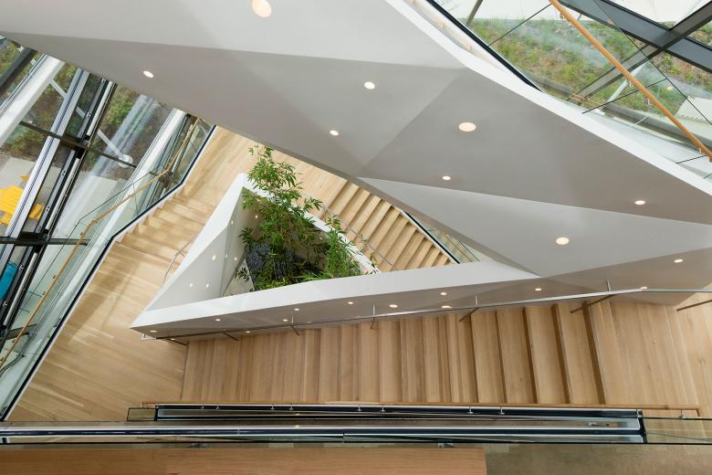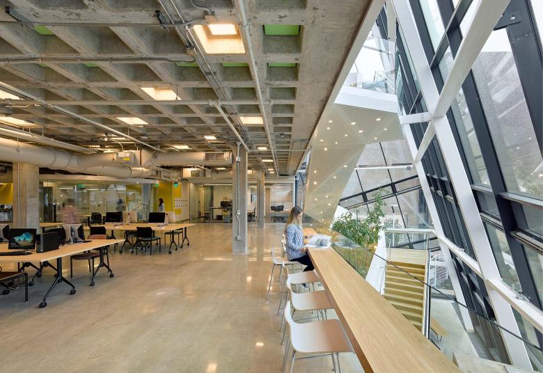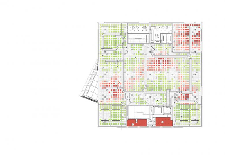 This strategy minimizes the impact of the renovation on the building structure, which is nearly all maintained for the accommodation of the library program, and minimizes the risk of costly modifications to the existing two-way waffle slab.