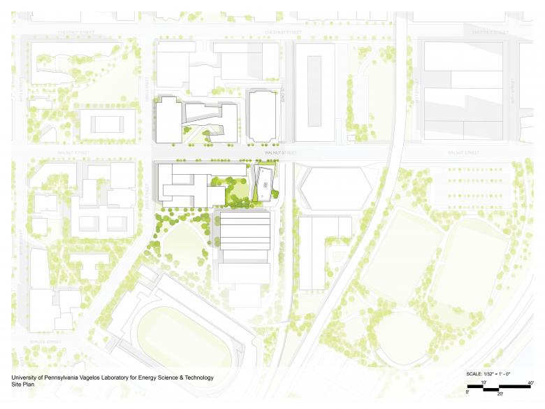 The VLEST is designed to serve as a gateway to the campus, bridging the height difference between Walnut and 32nd Streets. It introduces a plaza deck, creating a pedestrian link between Walnut Street and the Palestra, the university's historic basketball arena, while also connecting with Shoemaker Green. The building includes high-performance labs, office spaces, and collaboration areas, with double-height spaces fostering interaction. The labs are strategically placed along the eastern facade, offering views of the Schuylkill River. The building incorporates a range of passive design strategies, such as operable windows for natural ventilation and a high-efficiency heat recovery system to reduce energy use.