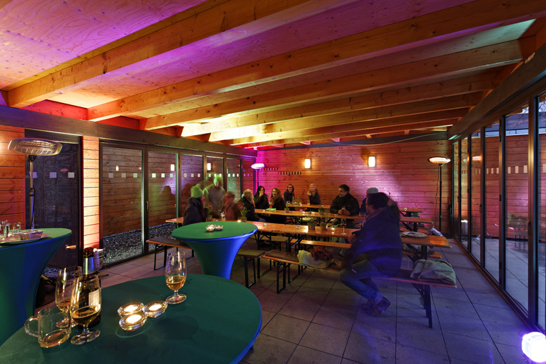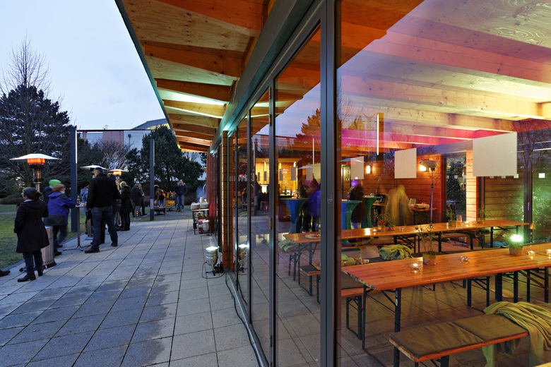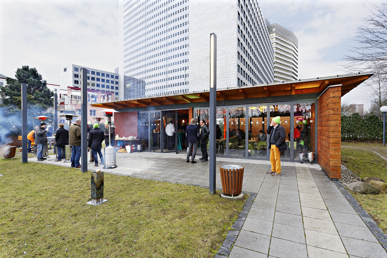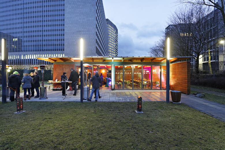 Grillen im Schatten der Banktürme – Die Anfrage der Sportstätten der Deutschen Bank war eine nicht alltägliche für die Architekten bei .bieker: Sie sollten auf einem Grundstück in der Bürostadt Frankfurt-Eschborn eine Grillhütte planen. Diesem Wunsch kam die .bieker AG gerne nach. So entstand ein kleiner Grillpavillion, der seine Anklänge bei großen Vorbildern sucht. Aus dem ursprünglich gewünschten sommerlichen Freisitz und Wetterschutz wurde eine kleine, aber feine Grillhütte, die ganzjährig den Mitgliedern der Sportstätten der Deutschen Bank zur Verfügung steht.