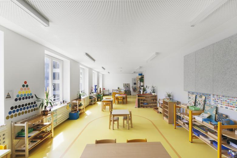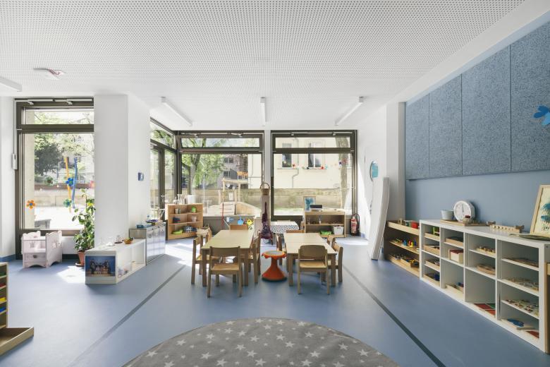 Dabei war architektonisch einiges zu beachten. Bedeutende Eingriffe in die Substanz waren erforderlich, um die vorhandenen Qualitäten zu stärken. Farben führen künftig als Leitsystem durch die Gebäudebereiche. Jeder einzelne Raum erhielt eine individuelle Lösung, um dessen Charakter hervorzuheben. Zudem entstanden um die Häuser neu gestaltete Freiflächen, die viele Spielmöglichkeiten bieten.