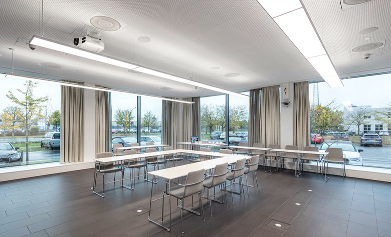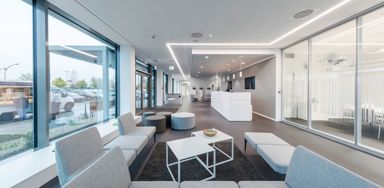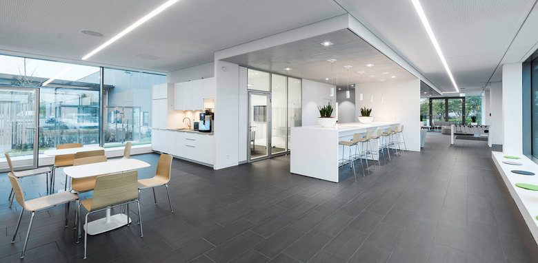 Der zweigeschossige linear-rechteckige Zweckbau aus den 1970 Jahren wurde komplett entkernt und bis auf die tragenden Bauteile zurückgebaut. Sowohl das Erdgeschoss als auch die beiden Bürogeschosse wurden neu strukturiert. Dabei wurden auch Anforderungen an moderne Arbeitsplätze sowie der Bedarf an Austausch und Miteinander der Mitarbeiter berücksichtigt. Bei der Grundrissgestaltung wurden die Etagen brandschutztechnisch als 400qm-Einheiten betrachtet. Das ermöglichte die Umsetzung eines neuen Raumkonzepts mit offenen und weitläufigen Bürostrukturen.