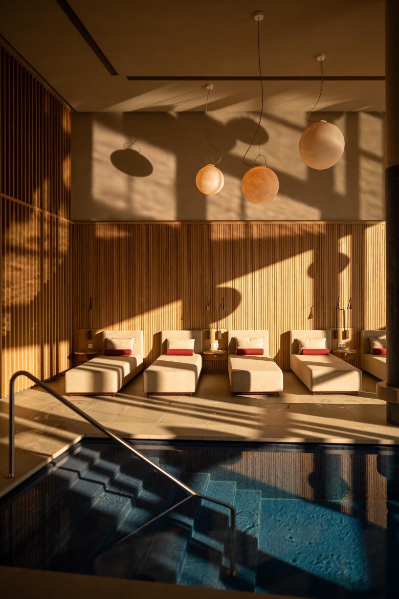 Interior Design des neuen Innen- und Außenpools und der Fitnessbereiche im Hotel Castel.
