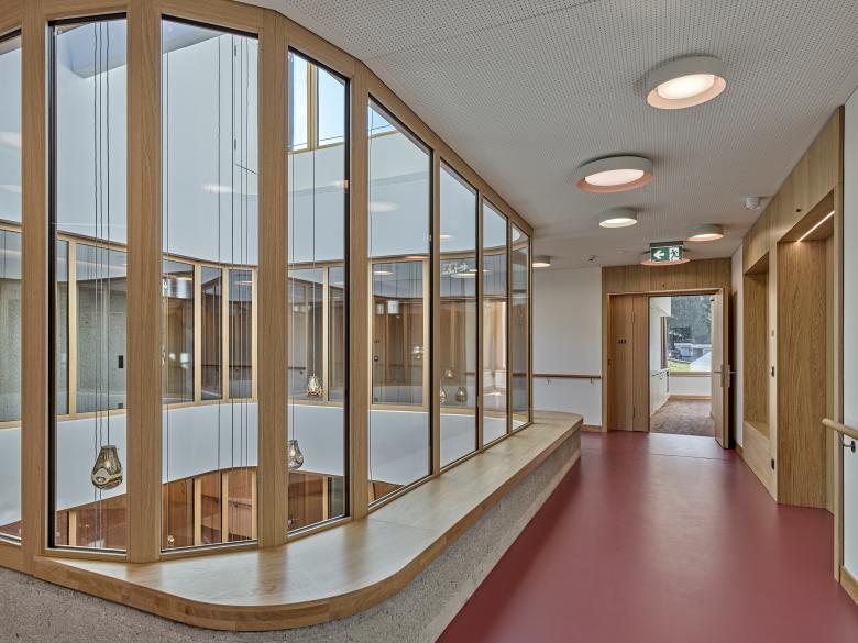 Wo einst eines der ersten Luxushotels der Region stand, entsteht ein sozialer Neubau, der Assoziationen an das eigene Zuhause weckt. Das Projekt stärkt die städtebauliche Situation und trägt durch das Angebot eines (Dorf-)Platzes zur Quartierbildung bei. Um Menschen zu begleiten, die auf unterschiedlichste Art und Weise und in unterschiedlicher Intensität Pflege und Betreuung benötigen, sind die inneren Strukturen einerseits auf Flexibilität und effiziente Abläufe ausgerichtet. Viel Tageslicht, grosszügige Erschliessungsflächen und offene gemeinschaftlich genutzte Bereiche schaffen andererseits ein angenehmes Ambiente zum Leben und Arbeiten.