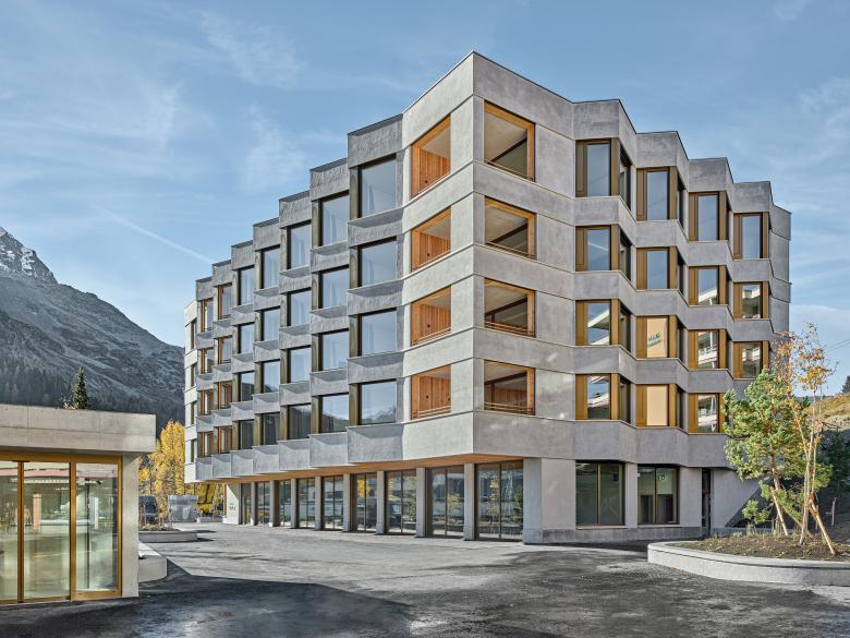 Das Motiv des traditionellen Engadiner Erkers wird aufgenommen und neu interpretiert. Jedes Zimmer verfügt über einen Erker und profitiert so von einer zweiseitig orientierten Aussicht. Die Bewohnerinnen und Bewohner können in die Fensternische sitzen und den Blick über den See, die Alpen oder den belebten Platz schweifen lassen. Aussen bezieht sich die mineralischer Waschputzfassade das Gestein der Alpenumgebung, während innen Oberflächen aus Holz eine warme Atmosphäre schaffen und an traditionelle Innenräume der Region erinnern.