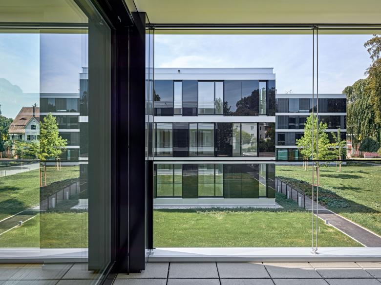 Der akzentuierte Sockel der schwarzen Kuben markiert die Schnittstelle zwischen Gebäude und Park, zwischen privat und kollektiv. Das Konzept kommt ohne Privatgärten oder grosszügige Zugänge von den Erdgeschosswohnungen in den Aussenraum aus. Für gemeinschaftliche Aktivitäten steht den Bewohner*innen der historische Gartenpavillon zusammen mit dem angrenzenden Freibereich zur Verfügung.