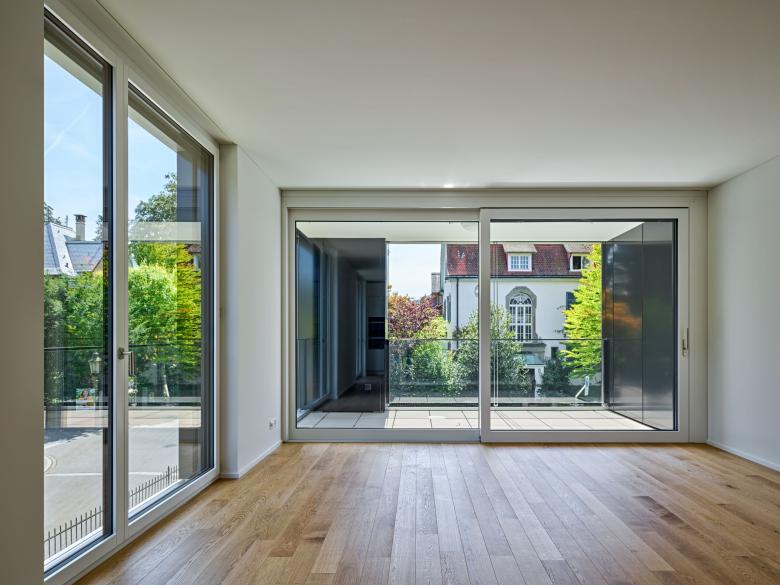Beinahe alle der 14 neuen Mietwohnungen öffnen sich auf drei Seiten zum Aussenraum und vermitteln der Bewohnerschaft das Gefühl, im Grünen zu wohnen. Die Grundrisse reagieren von Geschoss zu Geschoss spezifisch auf die gebaute und gewachsene Umgebung, so dass der jahres- und tageszeitliche Wechsel der Atmosphäre im Park den Charakter der Wohnungen prägt.