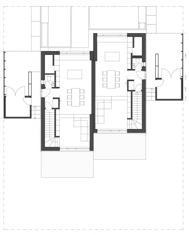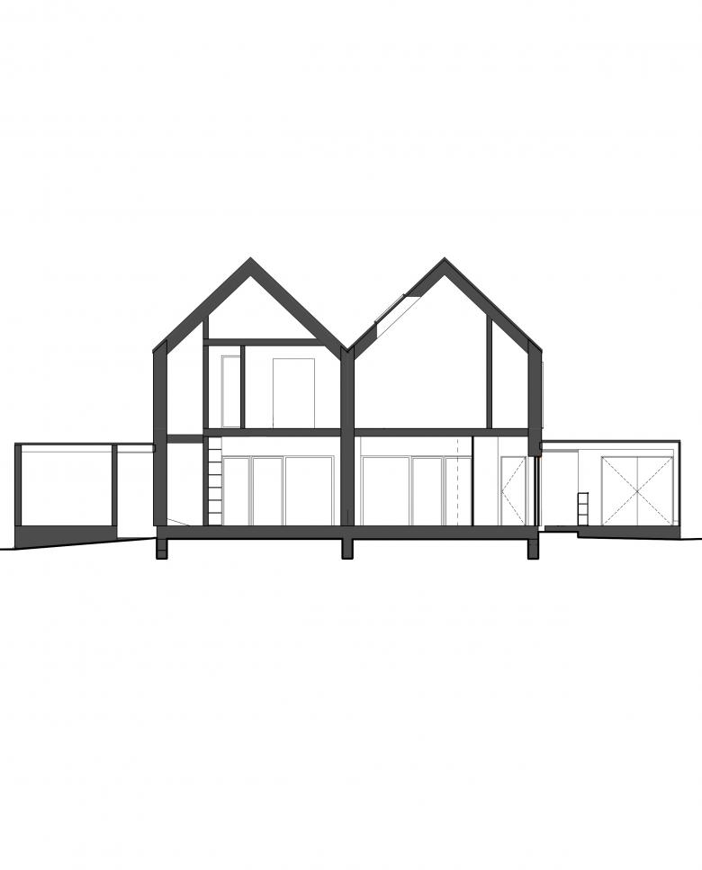 Ein Doppelhaus mit zwei klassischen Satteldächern, auf das Wesentliche reduziert.