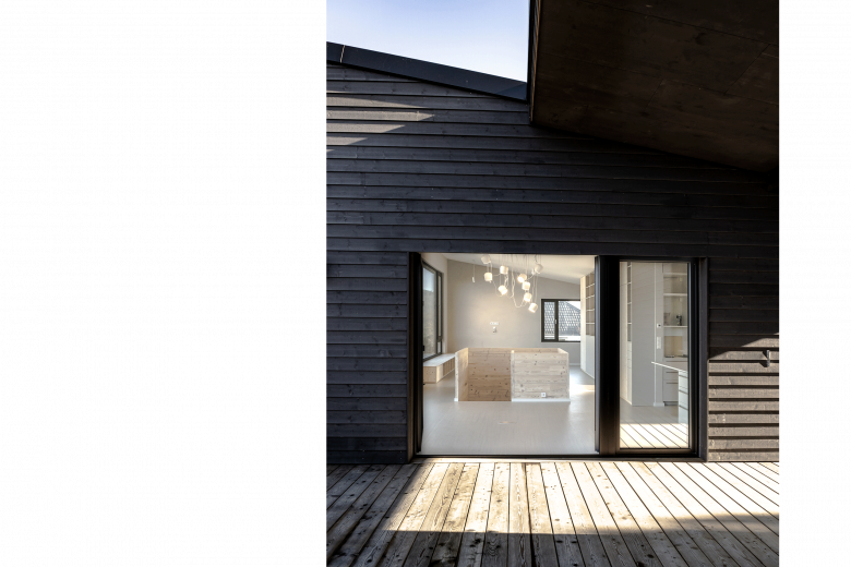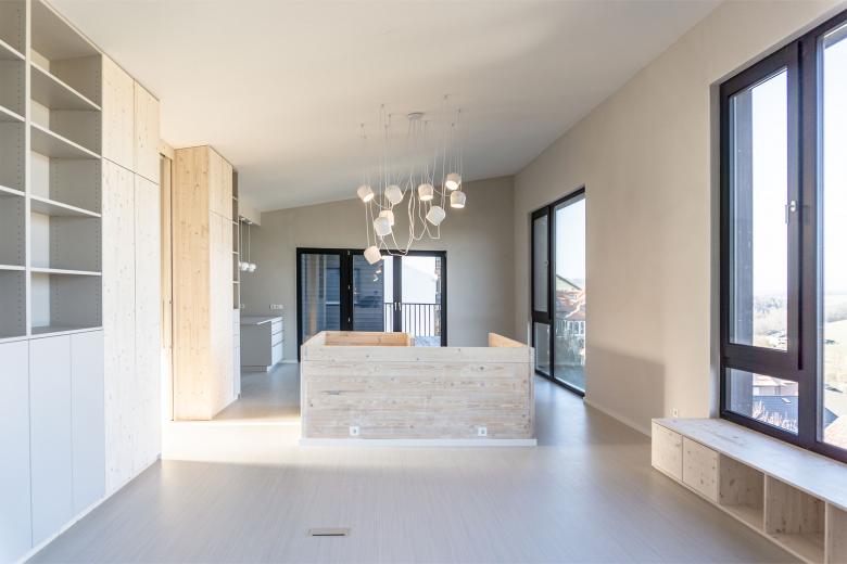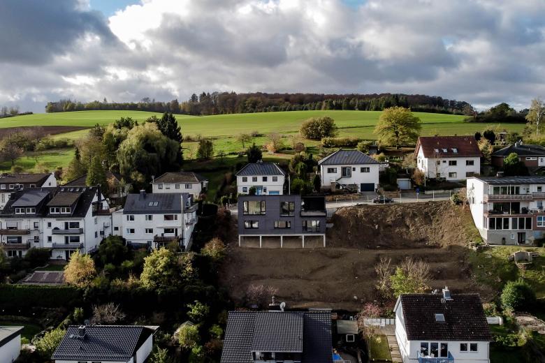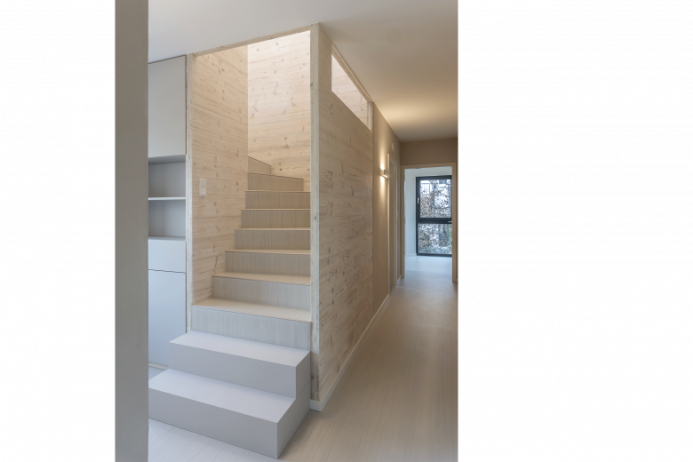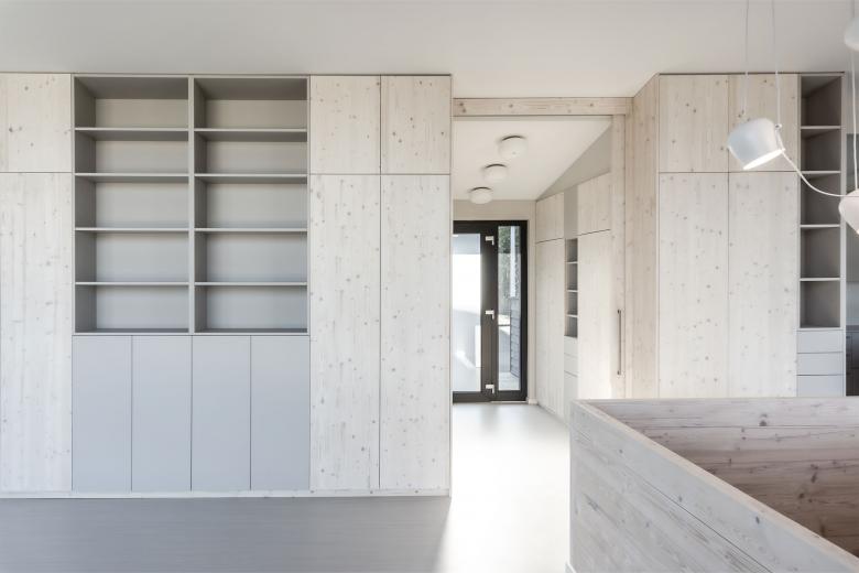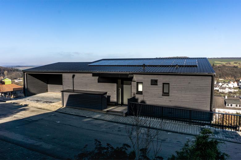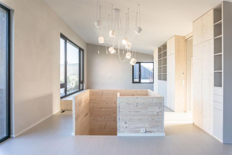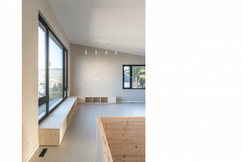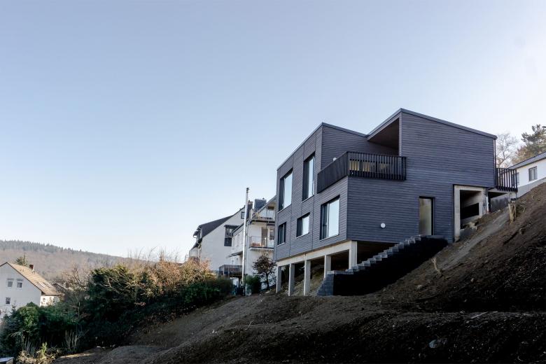 Nur fliegen ist schöner! Ein Einfamilienhaus am Steilhang mit 45° Hangneigung. Ein offenes Wohngeschoss mit einer Terrasse, wie eine Aussichtsplattform. Das Heizkonzept mit 17 Kilowatt Primärenergiebedarf dank Lüftungsanlage mit integrierter Wärmepumpe, 8 Kilowatt-Peak Photovoltaik mit Speicher und ergänzender Infrarot-Folienheizung. Gebaut aus Holzstegträger-Konstruktion mit vorbewitterter Holzfassade, Linoleumböden, Lehmputz, Trockenestrich, Pappwaben-Trittschalldämmung und geöltem Dreischichtplatten-Inventar.