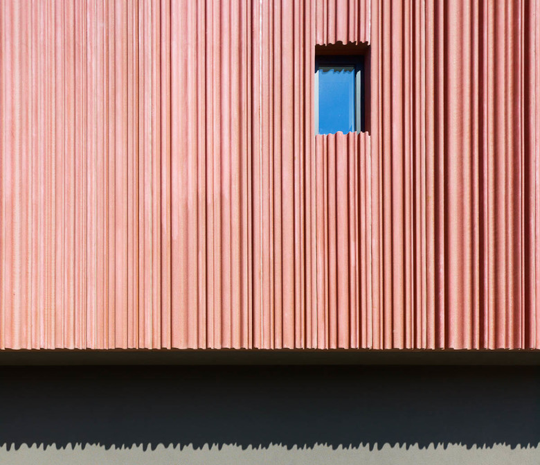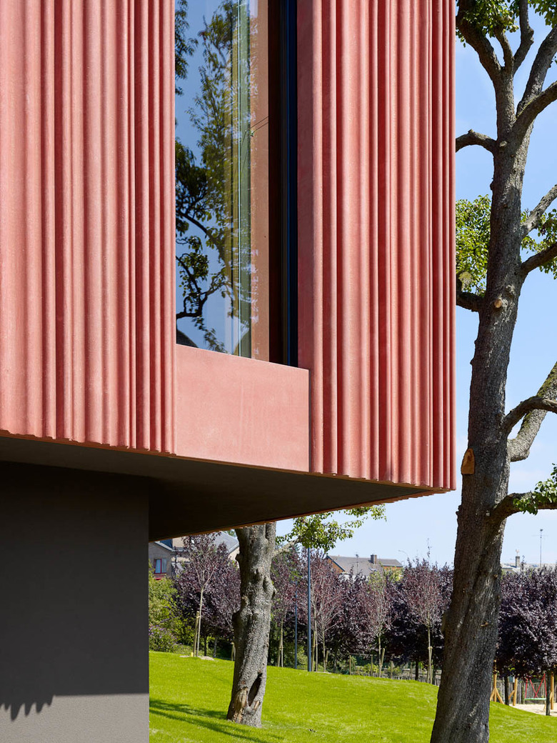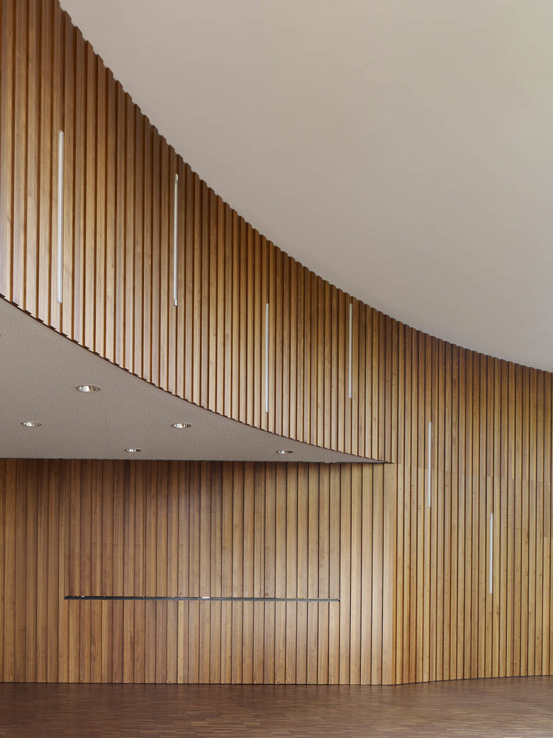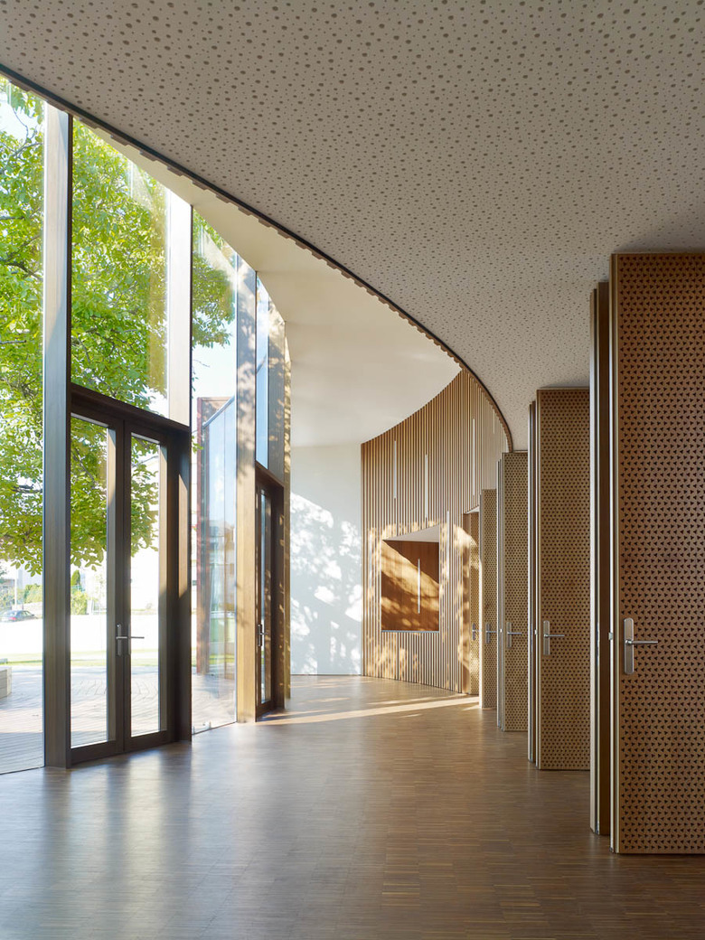 As an external expression of the building’s cultural role and its restrained festivity, a stylised red stage curtain serves as a metaphor for celebration, community and culture. Cast in concrete, it looks like a freeze-frame image, composed of nine individual molded precast concrete elements. It nevertheless seems to move back and forth as the light brightens or dims in time to the swaying branches. The windows are vertical bands of glass, splitting the curtain into strips as if it had simply been pushed to a side.
