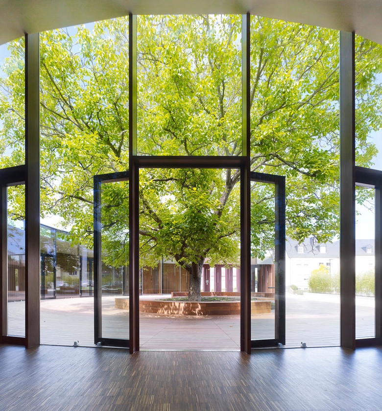 The welcoming stance of the semicircular inner courtyard, with a continuing facade built in structural glazing, contributes to the character of the building and draws the visitor to the heart of it. A curved wall, panelled in walnut, sweeps round to create a single uninterrupted space that surrounds the entire inner courtyard and leads to the main hall. The wall facing onto the tree is wholly glass, including glass doors that can be opened in fine weather to give access to the courtyard.