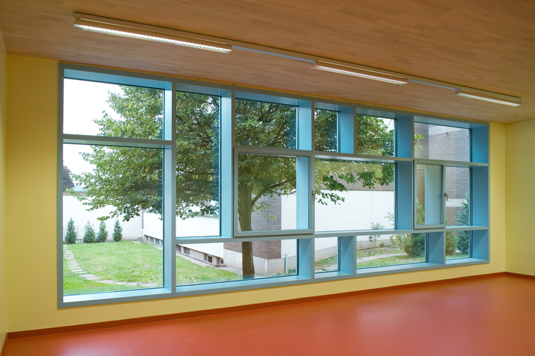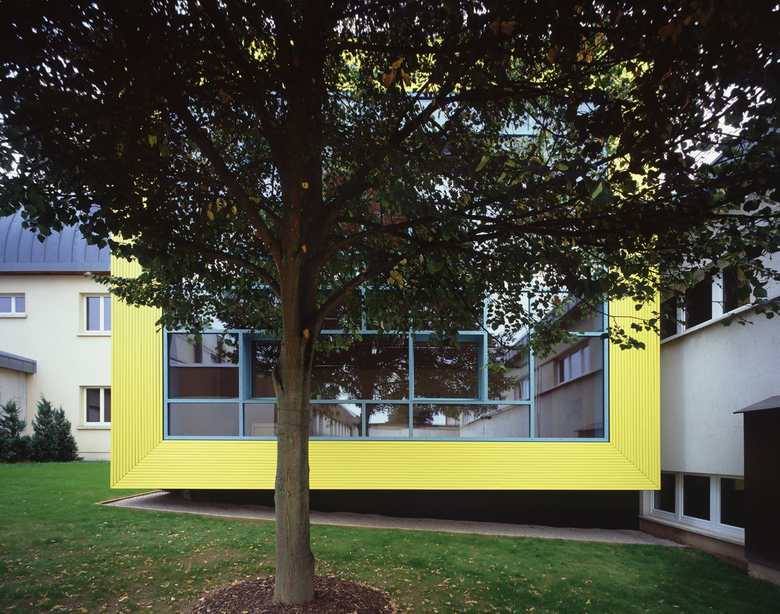 Ein rundum zugebauter, nicht zugänglicher und nur über die Korridorfenster einsehbarer Innenhof ist die letzte Platzreserve für dringend benötigten Schulraum. Die Gemeinde Hesperange verzichtete darauf beliebige Containerbauten in diesen Innenhof zu stellen und entschied sich diesen leeren, einzig mit einem Baum bestandenen Ort durch einen architektonischen Eingriff aufzuwerten. Der Hofraum - früher nur Restraum - wurde durch den Anbau belebt und zur Attraktion für den ganzen Schulkomplex und für das angrenzende Quartier.