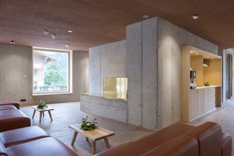 Der von starken Schalungsfugen gezeichnete Betonsockel mit Lochfenstern kontrastiert und verbindet gleichzeitig in der Oberflächentextur mit der feinen Holzschalung und einer bänderartig zusammengefassten Befensterung in den Obergeschossen. Die innenräumliche Gliederung nimmt die in der Situationslösung sichtbare Haltung auf und spielt mit der Dynamik von offenen und geschlossenen Bereichen und schafft Bezüge in die Nähe und Weite. Die Räume sind in unterschiedliche Nutzungszonen mit differenzierten Öffentlichkeitsgraden gegliedert: Das Erdgeschoss mit dem Eingangs- und Gemeinschaftsbereich, die Obergeschosse mit den Schlafbereichen mit total 160 Betten. Mit dem integralen Gebäudekonzept und entsprechender Gebäudetechnik sowie kluger Materialwahl wird der Standard Minergie-P-ECO erreicht.