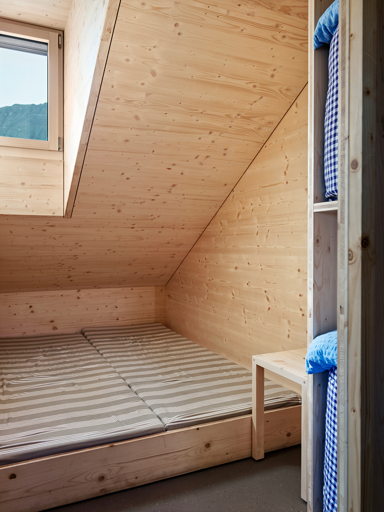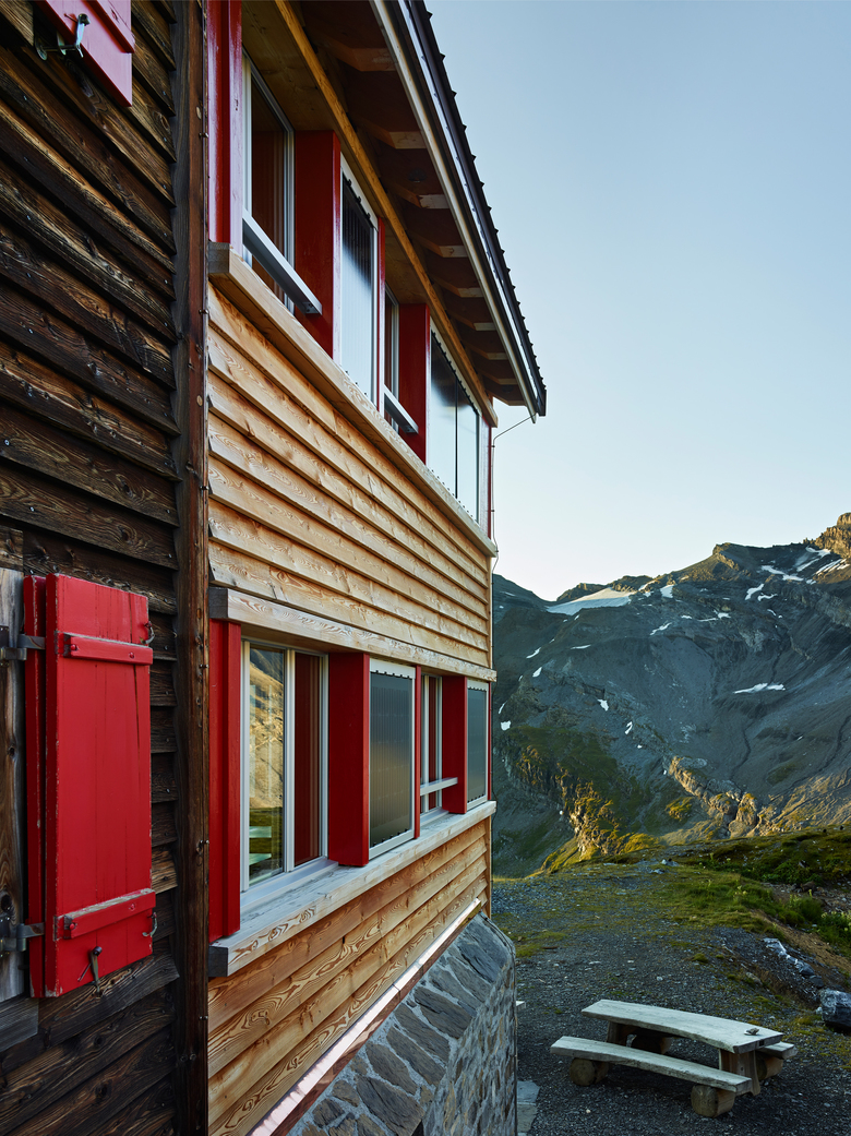 Die selbstverständlich wirkende talseitige Erweiterung stärkt diese Qualitäten und verbindet alte und neue Teile zu einem wohl proportionierten Ganzen. Erst der zweite Blick lässt feine räumliche, tektonische und materialmässige Brüche und Übergänge erkennen, z.B. über Details in der äusseren Lärchenschalung oder der inneren Oberflächenbehandlung, über die Fensteröffnungen, die integrierten Solarelemente oder die farblichen Akzente der roten Fensterläden und -leibungen.