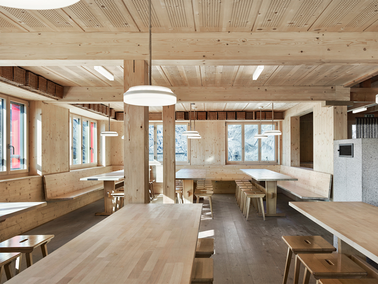Vor- und Rücksprünge schaffen im Sockelgeschoss einen schützenden Eingangsbereich. Mit der südöstlichen Erweiterung und der inneren Neuorganisation erhalten alle Geschosse mehr Raum, was die betrieblichen Abläufe optimiert. Vergrösserte Küche, neue Wasch- und Toilettenanlagen, klar definierte Besucher- und Personalbereiche sowie die räumliche Erweiterung der Ess- und Aufenthaltszone erzeugen einen angemessenen Komfort. In den Obergeschossen werden die (wie bisher) 98 Schlafplätze in attraktiven kleineren Räumen angeboten.