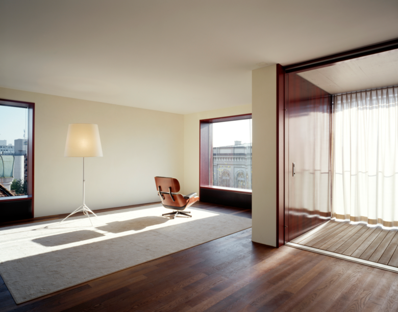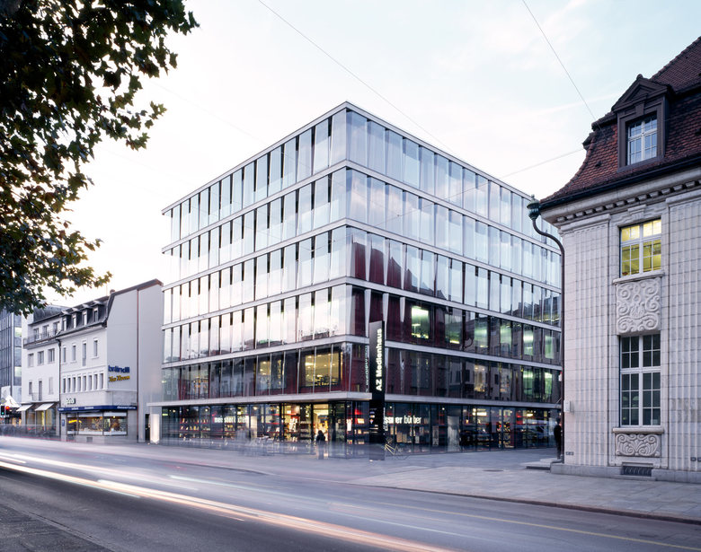 Während der Neubau des Wohn- und Geschäftshauses für die AZ-Medien-Gruppe im rückwärtigen Bereich unmittelbar an die Nachbarbauten anschliesst, tritt es an der Bahnhofstrasse als freistehendes Volumen in Erscheinung und fügt sich mit leichten Abdrehungen mühelos in die Reihe von repräsentativen Bauten ein. Die öffentliche Nutzung im Erdgeschoss und ein Durchgang, der die Bahnhofstrasse quer durch den neuen Block an die Altstadt anbindet, fügen den Neubau in die vorhandene Stadtstruktur ein. Diese räumliche Durchlässigkeit unterstreicht den öffentlichen Charakter des Gebäudes und stärkt die Eigenheiten des Ortes. Optisch unterstützt wird die neu geschaffene Verbindung im Bereich der Fussgängerpassage durch eine Volumenverengung auf der gesamten Gebäudehöhe. Sie erleichtert die Auffindbarkeit des zweigeschossigen Durchgangs und rhythmisiert die Längsfassade. Verfolgt wird sowohl ein Konzept des ergänzendverändernden Weiterbauens wie auch der expliziten Gegenüberstellung: Auf stadträumlicher Ebene wird die Grundkonzeption der die Bahnhofstrasse säumenden Stadthäuser beibehalten, wodurch sich das Gesamtvolumen in den Kontext einbindet, während in der Materialisierung neue Wege beschritten werden.