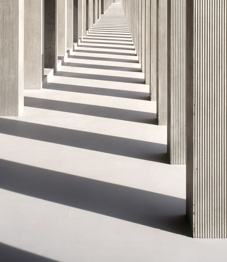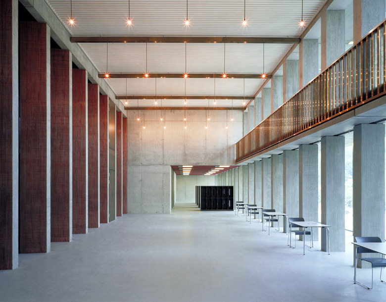Eine geheimnisvolle Entrücktheit kennzeichnet das lange, vollflächig verglaste Gebäude mit seinen charakteristischen Fensterprofilen aus Baubronze. Der tektonisch klar strukturierte, in seiner wahren Grösse jedoch kaum fassbare Solitär ist massiv und transparent zugleich. Den Vorbeifahrenden enthüllt das Schulhaus seine Bestimmung kaum, in seiner formalen Abstraktion könnte es auch ein Büro-, ein Labor- oder sogar ein Wohngebäude sein. Auch im Innern tritt die Nutzung nicht sofort in Erscheinung, weil sich die Klassenzimmer im Kern konzentrieren und nicht bis an die Fassaden vorstossen. Die Erschliessung erfolgt mittels Säulenumgang über die volle Gebäudelänge entlang der Fensterfronten. Der architektonische Ausdruck ist geprägt durch die Reihung von Betonstützen, deren gleichmässige Zwischenräume mit Glas ausgefacht sind. Die Konstruktion tritt offen zutage, auch fehlen jegliche Wandverkleidungen. Die fünf in die Tiefe gestaffelten Stützenreihen dienen der Verschattung, der räumlichen Definition der Zimmer und Korridore und der Aufnahme der Haustechnik. Dabei mutieren sie je nach Sichtwinkel zur geschlossenen Wand oder geben den Blick frei in die nächste Raumschicht.