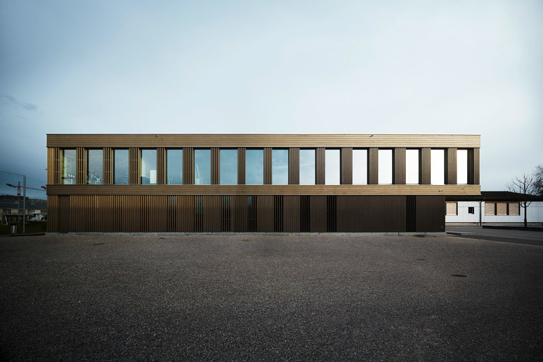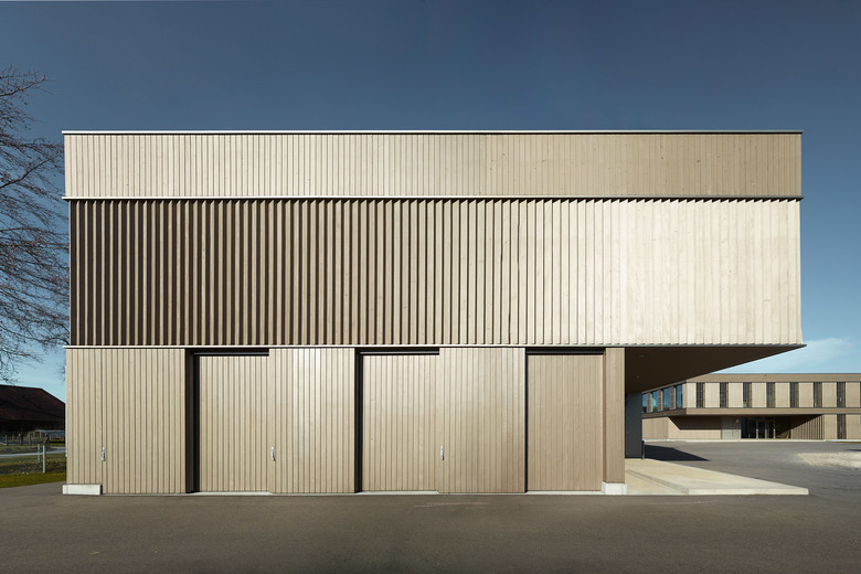 Die Erweiterung des bestehenden Schulpavillons zur vollständigen Primarschulanlage erfolgt durch zwei voneinander unabhängige Baukörper: eine Einfachturnhalle und ein zweigeschossiges Schulhaus. In der Höhenstaffelung sind die Volumen leicht differenziert und nehmen so den Massstab der angrenzenden Bebauung auf. Die nunmehr drei Gebäude gruppieren sich um einen zentralen Platz, von dem aus die jeweiligen Eingänge erreicht werden. Als Antwort auf die ländliche Umgebung und die Anforderungen bezüglich Nachhaltigkeit eines öffentlichen Gebäudes wurde eine Holzbaukonstruktion gewählt, deren Kerne mit massiven Bauteilen in Sichtbeton ergänzt sind. Diese Bauweise ermöglicht eine serielle Produktion, räumliche Flexibilität und reagiert mit ihrem geringen Eigengewicht zudem auf die Baugrundverhältnisse. Die äussere Erscheinung ist durch ein Spiel von geschlossenen, lamellierten, halbtransparenten oder vollständig verglasten Bereichen geprägt. Je nach Blickrichtung und Lichtverhältnissen erscheint das Bauwerk bald schwer und solid, bald beinahe leicht und flüchtig. Durch die Metallpigmentierung des Holzanstrichs erhält die Aussenhaut einen edlen Glanz, die den gemeinhin mit Holz assoziierten Eindruck verfremdet und die Langlebigkeit der Holzverschalung sicherstellt.