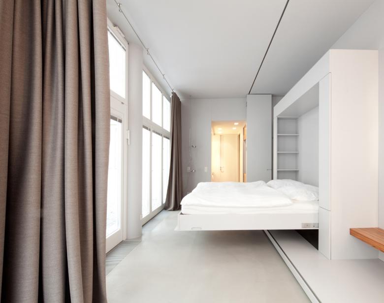In der Wiener Innenstadt schuf sich ein Ehepaar einen wandelbaren Raum. Das kompakte, hochwertig ausgestattete Loft sieht zwei Zustände vor. Im geschlossenen Zustand erkennt man nur weiße Oberflächen, der Ort lässt so auf nichts schließen. Im offenen Zustand verwandelt sich der Raum in einen privaten und komfortablen Schlafbereich mit extra großem Bett und separatem Loungebereich, die Nebenräume bestehen aus Schrankräumen und Badezimmer. Sämtliche Funktionen sind in einem umlaufenden Schranksystem verbaut.
