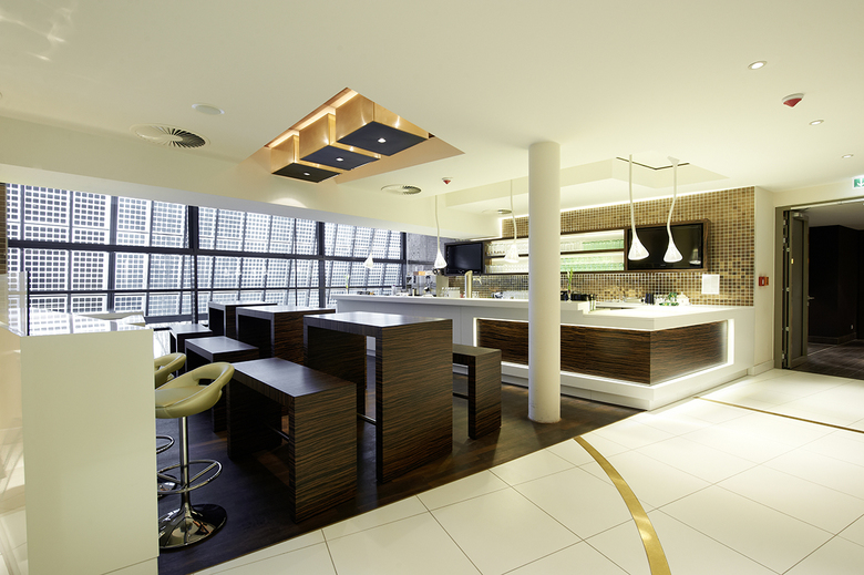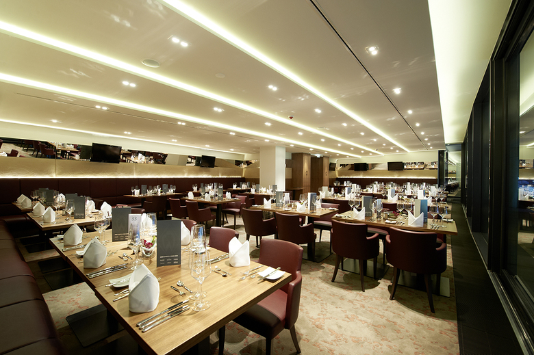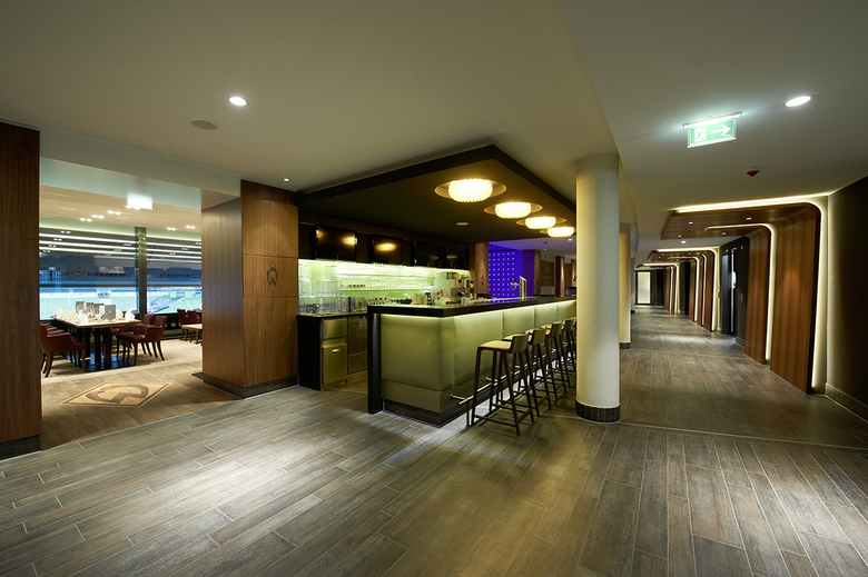 Die Restaurants sind durch einen schweren, gewebten Teppich als ruhige Zone definiert. Der Kommunikationspunkt vor und nach dem Spiel sowie in der Pause ist die zentrale Bar im Vorbereich. Der Gast ist im Fokus, wenn er auf dem Weg zu seinem Tribünenplatz über einen roten Teppich geht und durch den Lichttunnel quasi wie ein Spieler das Stadion betritt.