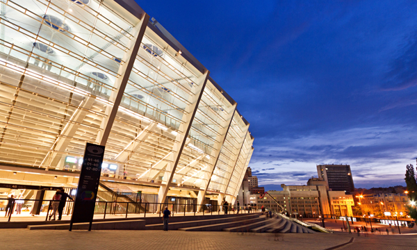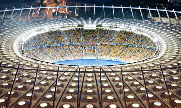Das Kernelement des Stadion Kiev bildet die schalenförmige Tribüne, dessen Untersicht flächig aufgehellt wird. Durch die Aufhellung ist auch die Transparenz von außen nach innen gewährleistet und die Ablesbarkeit der Fassade gegeben.