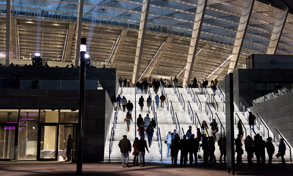 Währende die Umgänge und die Tribüne in einem warmen Lichtton gehalten sind, erhält die Membrandachbeleuchtung eine neutral weiße Lichtfarbe.