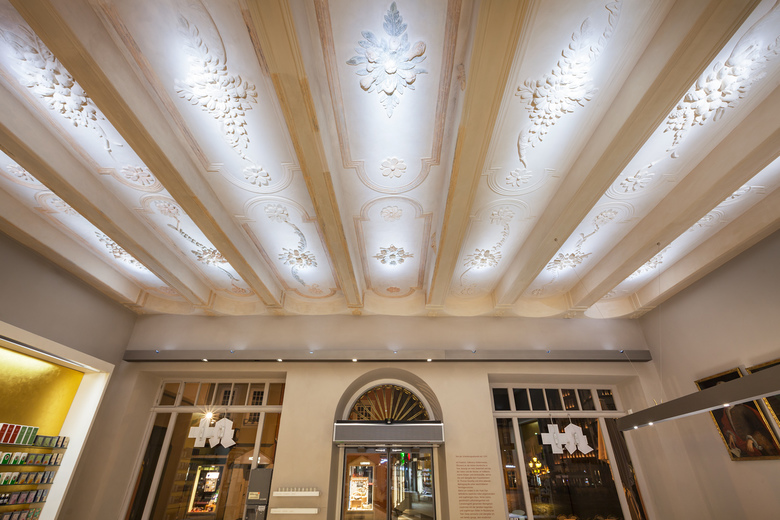 - Farbkonzept für Waren und Verkaufsbereich mit kühler Lichtfarbe 4.200 K und Aufenthaltsbereiche mit historischen Elementen in Warmton 3.000 K. Ausnahme ist die „Kölner Decke“ mit 5.000 K / CRI 95 mit einer sehr guten "Weißtonwiedergabe“.
