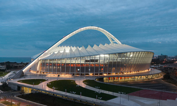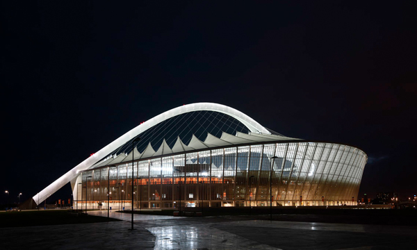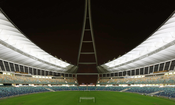 Für die Dachaufhellung wurde Leuchtstofflampe mit neutralweißer Lichtfarbe gewählt. Mit einer punktförmigen Lichtquelle würde der Schattenwurf durch die Dachfalten das Bild verzeichnen und eine unruhige Dachlandschaft ergeben. Die Strahlungsgeometrie wurde so ausgelegt, dass weder in den Außenraum noch in den Innenraum eine Fehlstrahlung abgegeben wird. Leider trifft das auf die Flutlichtanlage nicht zu, die von einem Hersteller geplant und ausgeführt wurde. Die Lichtbänder sind im Catwalk untergebracht. Um über die Dachausladung eine gleichmäßige Verteilung zu bewerkstelligen, wurde der Gesamt- strahlungsbereich auf drei Lichtbänder mit jeweils sich überlappenden Strahlungsbereichen aufgeteilt. Trotz der Höhe wurde für die Tribünenbeleuchtung ebenfalls Leuchtstofflampe gewählt, aber mit warmer Lichtfarbe. Die engstrahlenden Leuchten mit einer hohen Längsentblendung sind auch im Catwalk untergebracht.