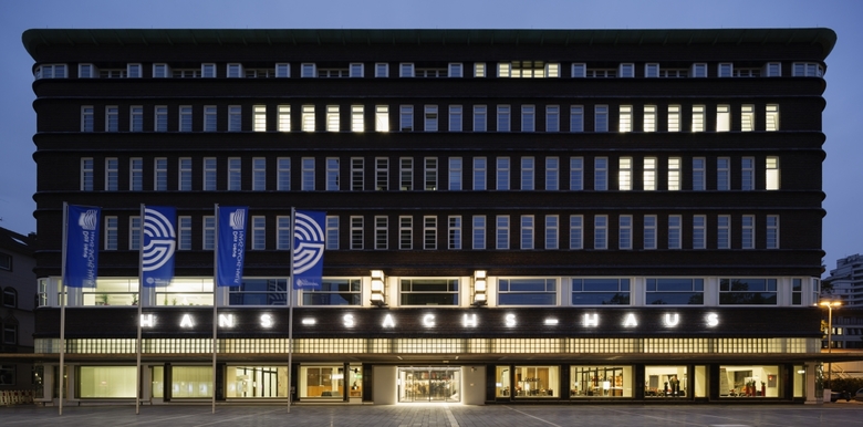 Das Neue Hans-Sachs-Haus mit seiner denkmalgeschützen Backsteinfassade erforderte als neues Rathaus mit öffentlichem Bürgerforum ein differenziertes Lichtkonzept. Das Augenmerk wird ausschließlich auf die repräsentativen Bereiche gelegt.