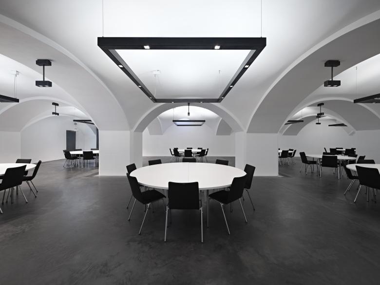 Einzigartig für ein Verwaltungsgebäude sind die historischen Gewölbe im Untergeschoss. Der Zacherlsaal als Veranstaltungsort war Ausgangspunkt des Lichtkonzeptes. Acht schwebend anmutende rechteckige Profilleuchten haben sich als ruhigste Form in den verschiedenen Gewölbegeometrien erwiesen. Auf Grund der geringen Betriebszeiten und der hohen repräsentativen Bedeutung des Saales, haben wir den Direktanteil mit eigens dafür entwickelten Reflektoren eingeplant, um eine hohe Brillanz und klare Schatten in der Lichtwirkung für eine festliche Stimmung zu erreichen. Die Indirektkomponenten des Bankettlichtes sind mit LED ausgestattet, um jede Gewölbekuppel einzeln diffus auszuleuchten. Es wurde darauf geachtet, dass die dazwischen liegenden Gurtbögen nicht angestrahlt werden. Der Architekt zitiert in der Materialwahl mit Stahl und Eiche die alten Holzbierfässer, was auch bei den Leuchten im gesamten historischen Teil weitergeführt wurde. Eine Herausforderung war, die Leuchten in ihren Dimensionen an die jeweiligen unterschiedlichen Raumdimensionen anzupassen. Hierfür waren individuelle Sonderplanungen erforderlich. Da im Gewölbekeller die Räume durch Glaswände getrennt sind, bleibt ein Sichtbezug der Leuchten untereinander erhalten.