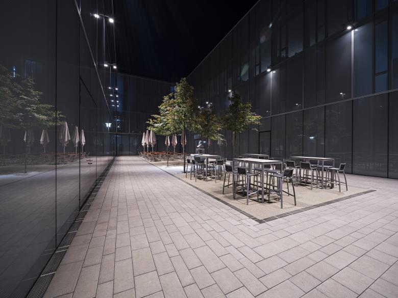 Der Innenhof im UG ist durch 18 Sonderaufbauleuchten kantenscharf ausgeleuchtet. Zusätzlich wird der Paulaner Brunnen mit zwei engstrahlenden Spots betont.