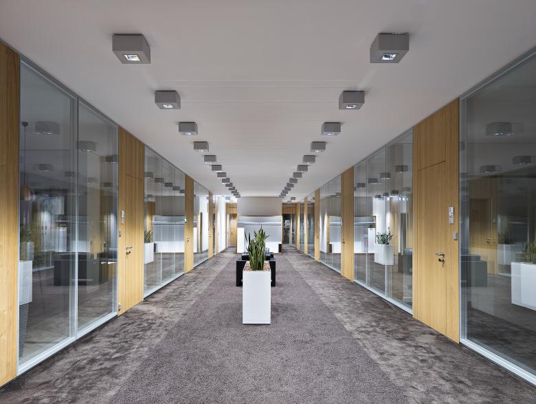 Für den Wartebereich im EG wurden LED Aufbaudownlights mit Korona-Effekt entworfen. Diese Leuchte kommt im Gebäude mit verschiedenen Lichteinsätzen vor, je nach Beleuchtungsanforderung. In den Büromittelzonen und Fluren im EG, 1.OG und 2.OG sind die Downlights ohne Indirektkomponente ausgeführt