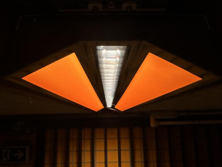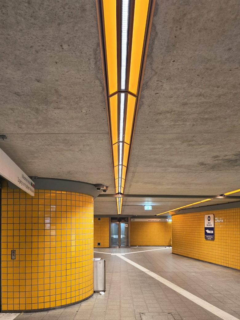 In der Verteilerebene sorgten nackte Leuchtstofflampen für die normgerechte Ausleuchtung bar jeder Qualität. Die Achsabstände der Lichtbänder in der Sichtbetondecke waren festzementiert. Der Strahlungswinkel der Leuchten musste deshalb quer zur Leuchtenachse auf 60° ausgelegt werden, damit die Überstrahlung bis zur nächsten Achse reicht. Die Leuchten wurden mit zwei Lichtfarben ausgestattet, tagsüber läuft die Anlage mit 4.000K und wird nachts auf 3.000K umgeschaltet. Die „zweilampige“ Ausführung bringt zwar höhere Investitionskosten mit sich, aber durch die Halbierung der Betriebszeiten verdoppelt sich auch der Wartungszyklus. Die Leuchte wurde auch mit zwei geneigten Lichtflügeln versehen. Die Flügel in einem den Fliesen angenäherten Farbton sind hinterleuchtet, tragen aber nur rund 5 Lux zur Grundbeleuchtung bei. Durch die Flügel wird die Betonfuge flächig geschlossen und stiftet Identität. Nebenbei erhöht sich durch den Versatz der Lichtaustrittsöffnung nach oben die visuelle Qualität der Verteilerebene.