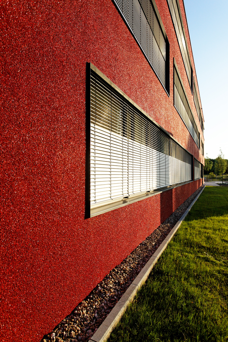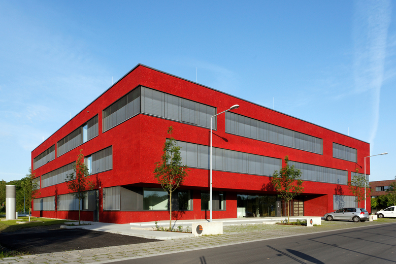 Außen vs. Innen – Der anspruchsvollen Bauaufgabe entsprechend erhalten die Außenfassaden eine besondere Gestaltung. Eine Putzbekleidung mit einem Zuschlag aus rotem, gebrochenem Glas, lassen den kubischen Baukörper in der Sonne strahlen und glitzern. Farblich harmonisch in das Umfeld aus roten Ziegelbauten eingefügt, bewahrt sich der Baukörper auf diese Weise sein Alleinstellungsmerkmal. Mit der Bewegung des Betrachters und unterschiedlichen Belichtungssituationen innerhalb eines Tages wechselt der Baukörper ständig seine äußere Erscheinung und lädt zur Entdeckung ein. Der besondere und aufgrund der räumlichen Struktur entstehende zentrale Innenraum erfährt ebenfalls in seiner Materialität eine besondere Inszenierung. Die gesamten Oberflächen der Decken und Wände sind im Etrium als akustisch wirksame Holzverkleidungen, die Bodenbeläge des Atriums und der Terrassen als Parkettbelag ausgeführt. Dadurch erhält der Innenraum einen besonderen, wohnlichen und eher informellen Charakter. Pflanzbecken und Sitzobjekte ergänzen die Wahl der Materialien.
