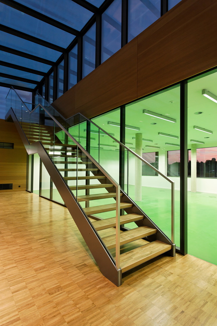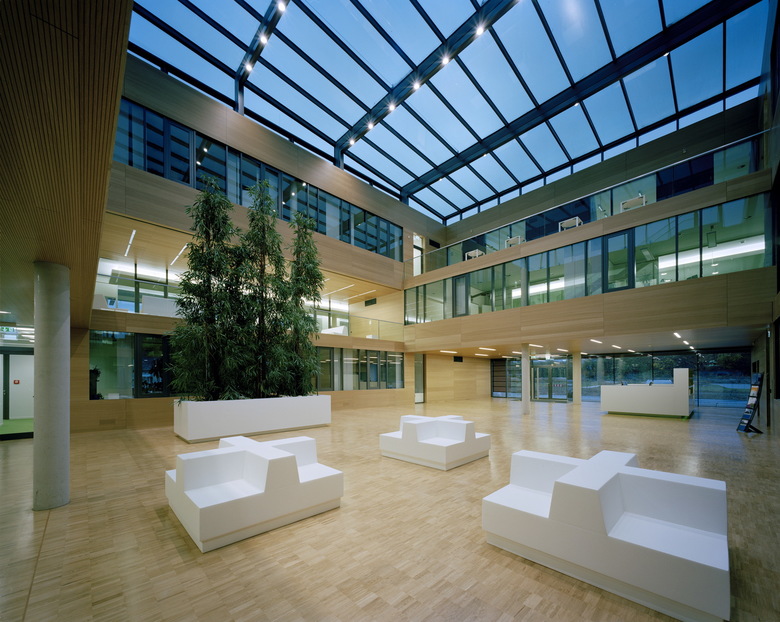 Konzept – Der kompakte, 3-geschossige Baukörper basiert auf einem quadratischen Grundriss mit rund 38 m Kantenlänge und einem innen liegenden, glasüberdeckten Atrium. Er weist ein sehr gutes Verhältnis der Gebäudehüllfläche zum beheizten Gebäudevolumen (A/V Verhältnis) auf. Die Grundfläche bilden jeweils zwei sich gegenüberliegende Winkel. Sie sind geschossweise gestapelt und um 90° gegeneinander verdreht. Auf diese Weise entsteht der besondere Innenraum mit den charakteristischen Terrassen. Diese liegen sich auf jedem Geschoss gegenüber und bieten ein Angebot an den Nutzer zur Kommunikation und informellen Nutzung.