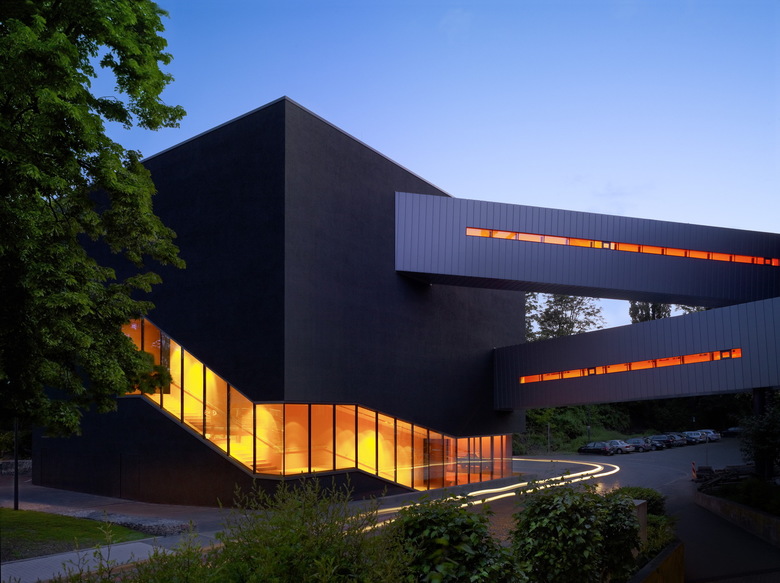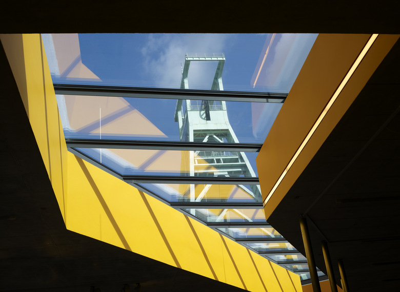 Städtebau – Der Kubus des Neubaus bildet klare Raumkanten zur Schillerstraße und orientiert sich in seiner Höhe am Bestandsgebäude. Er ist soweit wie möglich an die nordwestlich Grundstücksgrenze gerückt und über zwei Brücken auf den Geschossen +1 und +2 an das Bestandsgebäude angebunden. Die südliche Begrenzung des Grundstücks wird durch den Bahndamm gebildet, westlich und nördlich grenzt das Grundstück direkt an die Schillerstraße, im Osten grenzt es an ein Grundstück mit einer Neubebauung eines Parkhauses für die Polizei. Über die prägnante Fassade, die sich als Schnitt durch ein Stollensystem darstellt, wird die Funktion des Gebäudes in den Stadtraum vermittelt. Dieses Spiel bildet sich auch in der Dachfläche ab, die durch den Blick vom Fördergerüst als fünfte Fassade eine wesentliche Ansicht des neuen Museums darstellt.