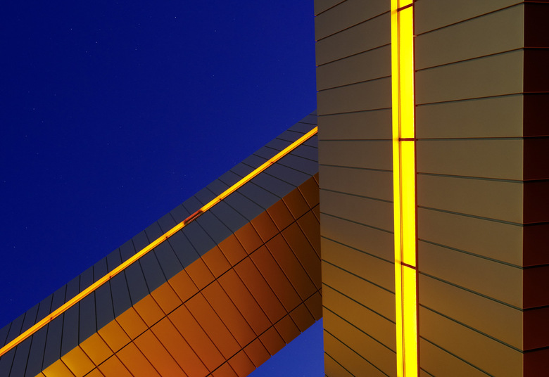 Fassade – Der geschlossene Anteil der Fassade besteht aus einer fugenlosen rauen Putzoberfläche in schwarzer Farbgebung mit eingeblasenen glitzernden Siliciumcarbid-Splittern. Dies wird durch eine vorgehängte, hinterlüftete Putzfassade mit Trägerplatten aus Blähglasgranulat und entsprechender Armierung möglich. Die Dachfläche wird durch farblich an die Putzfassade angeglichene aufgeständerte Betonsteine gebildet. Im Bereich der Stollen und des Foyers gibt es eine Glasfassade als Pfosten-Riegelfassade, in den oberen Bereichen mit absturzsichernder Verglasung.