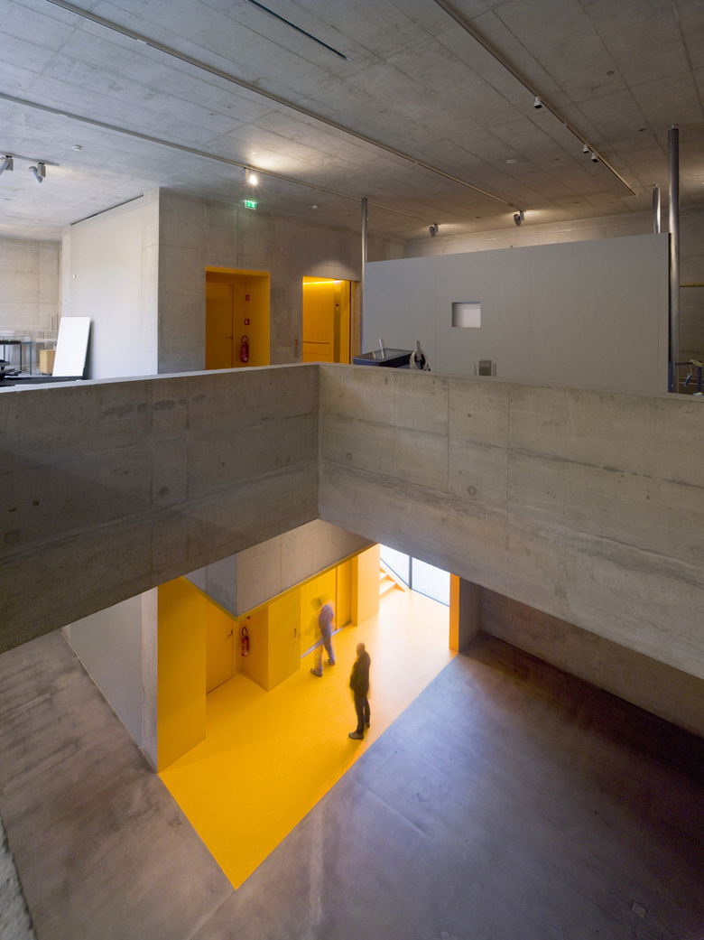 Innenräume – Die Oberflächen der Innenräume sind weitestgehend Sichtbetonflächen. Die Wand-, Decken- und Bodenflächen der Erschließungsräume (Stollen, Brücken und Foyer) sind farblich (melonengelb) von den Oberflächen der Ausstellungsräume abgesetzt. Die melonengelben Böden werden durch eine PU-Beschichtung des Betons gebildet, in den übrigen Bereichen bestehen diese aus anthrazitfarbenem Magnesitestrich. Auf abgehängte Decken und Innenwandverkleidungen wird in den Ausstellungsräumen verzichtet. Durch ein System von Stromschienen können die Leuchten der Ausstellungsbeleuchtung frei positioniert werden.