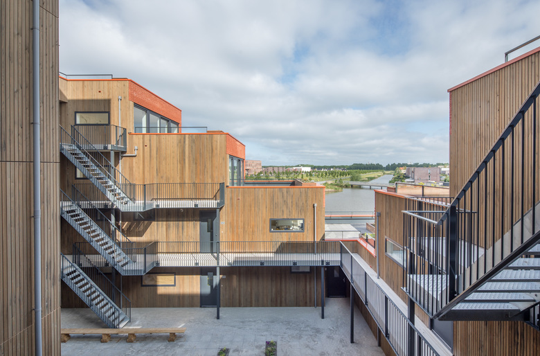Das Wohnprojekt „Urban Villa“ befindet sich auf dem Achillesveld im Stadtteil Poort in Almere. Die Lage bildet den Schnittpunkt zwischen dem offenen Grün der Umgebung, dem öffentlichen Parkbereich und den angrenzenden Wasserrouten. Kompakte Villen mit 75 bis 125 m² Wohnfläche sind um einen zentralen Innenhof herum gestapelt, einem privaten Raum, der gleichzeitig eine Oase der Ruhe und ein Ort der sozialen Interaktion für die Bewohner ist.
