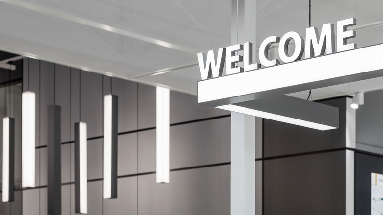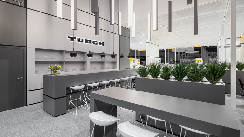 Große LED-Wände ziehen die Blicke der Besucher auf sich und lenken den Fokus auf TURCK. Der Hospitality-Bereich präsentiert sich, gemäß der Farben des CIs in einem dunkleren Grau und verleiht dem Raum so eine ruhige Wirkung. Im oberen Bereich befinden sich separierte Büroräume für intensivere Gespräche. Durch eine großflächige Fensterfront bietet sich von hier aus ein unverstellter Blick auf die Markenwelt von TURCK.