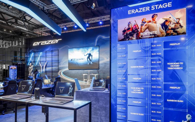 Die Themenwelten Technik, Games und Innovation begegnen sich auf der Standfläche und ermöglichen den Besuchern ERAZER als Marke für High-End-Performances und High-End-Gaming kennenzulernen. Die einfache Zugänglichkeit und die diversen Interaktionsmöglichkeiten schaffen positive Erfahrungen mit den Produkten. Das Gesamterlebnis, von der Markenwahrnehmung bis zu den spielerischen Touchpoints, bietet dem Messepublikum Einblicke in Potentiale von ERAZER.