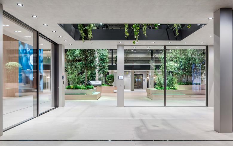 Unser Standkonzept basiert auf einem städtebaulichen Kontext. Wie wollen wir in Zukunft leben? Einladende Grünflächen rücken immer mehr in den Mittelpunkt urbaner Metropolen. So auch auf dem Schüco Messestand: Das Zentrum ist ein großer Garten, ähnlich einem Central Park, als Ort der Begegnung und grüne Lunge der Stadt. Umfangen wird dieser durch gebauten, urbanen Raum mit integrierten Schüco Produkten. Die Exponate stehen dabei für sich und werden in einem minimalen architektonischen Umfeld präsentiert.