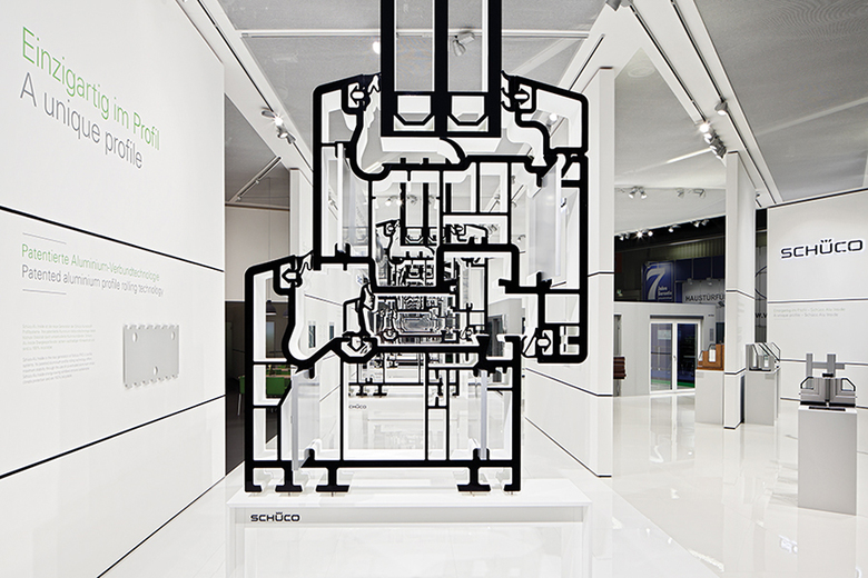 Das Messekonzept begrüßt den Besucher mit einer einladenden, architektonischen Geste: ein weit geöffneter Eingangsbereich lässt tief in den Stand blicken und lädt zu einem Besuch der Schüco Produktwelt ein. Auch an den anderen Außenseiten öffnet sich die Standarchitektur mit großzügigen Blickfenstern und Eingängen und schafft dadurch Transparenz. Gleichzeitig erhält die Architektur eine dynamische Anmutung, die sich im Inneren weiterführt: präsentiert werden hier im Dreiklang Kommunikation, zentrale Inszenierung und Produktexponate. Der gestalterische und konzeptionelle Schwerpunkt liegt auf der Inszenierung des Kunststofffensters „Schüco Alu Inside“, das in der Mittelachse des Standes räumlich erlebbar gemacht wird. Der Eingangsbereich führt den Besucher direkt in den „Experience Walk“: überdimensionale Profilquerschnitte inszenieren hier dramaturgisch in Form einer Ausstellung das Premiumprodukt, das mit seinem innovativen Innenleben Fachbesucher begeistern darf. Insgesamt sechs Profilschnitte werden en detail, makroskopisch auf Ausstellungspodesten präsentiert; rhythmisiert in ihrer Anordnung findet die Darstellung im Zentrum ihren Höhepunkt. Hier werden die Produktvorteile nochmals typographisch aufgearbeitet. Touchpoints an den Wänden ergänzen die analoge Präsentation auf interaktiver Ebene.