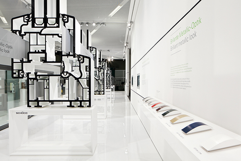 Flankiert wird der „Experience Walk“ von einer Präsentation weiterer Produktsegmente wie der Oberflächentechnologie Schüco AutomotiveFinish, dem fensterintegrierte Lüftungssystem Schüco VentoTherm oder der Hebeschiebetür für Niedrigenergiebauweise, Schüco ThermoSlide.