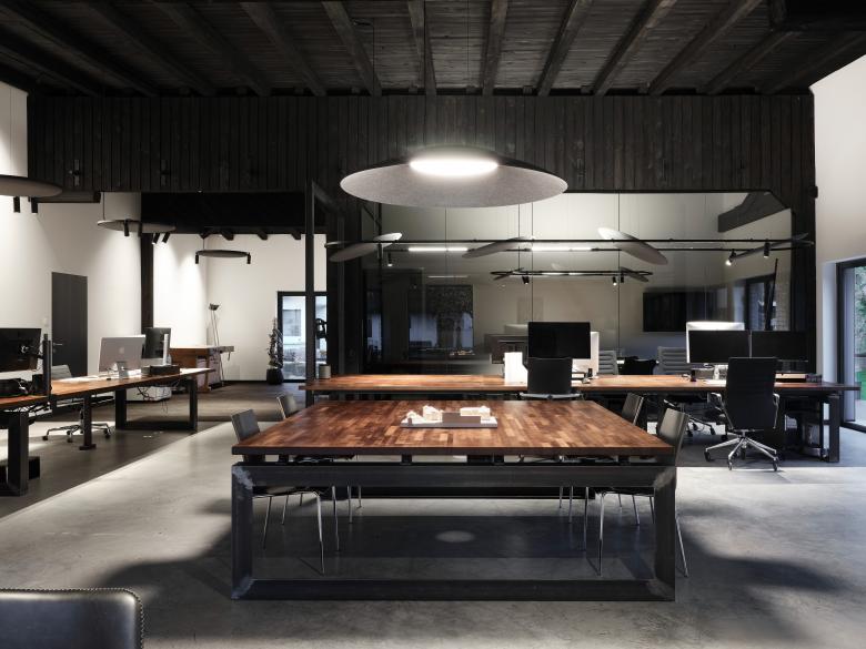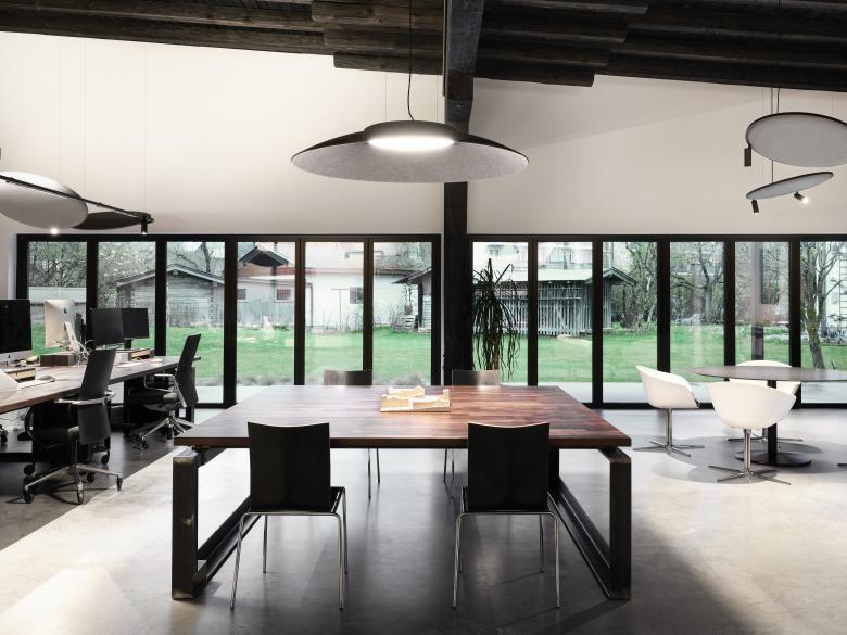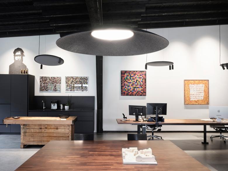 Im eigenen Büro setzte Michael Egger selbstverständlich auch auf Nachhaltigkeit und Flexibilität und entschied sich bezüglich der Beleuchtung und Raumakustik für das modulare Hybrid-Profilsystem Soliscape von Delta Light, da es Hocheffizienz mit sinnvollem Materialeinsatz verbindet. Denn der Werkstoff der integrierbaren Akustikpaneele besteht zu mehr als 60 Prozent aus recycelten PET-Flaschen und die Reflektoren für die professionelle Beleuchtung der Arbeitsplätze weisen eine ausgezeichnete Energiebilanz auf.
