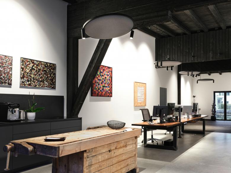 Über dem für sechs Mitarbeiter ausgelegten Team-Arbeitsplatz schwebt ein Soliscape-System, das mit jeweils dimmbaren stark entblendeten direkt und indirekt strahlenden Lichtlinien sowie mit justierbaren Spots mit Abstrahlwinkeln von 45° für Licht zur Allgemeinbeleuchtung und zum Arbeiten sorgt. Vier spielerisch diagonal in das System integrierte Akustikpaneele reduzieren den Nachhall des hohen, mit schallharten Oberflächen versehenen Raums und tragen damit zur Schaffung eines ruhigen Arbeitsumfelds bei. Eine zweite kleinere Konfiguration beleuchtet den mit einer Glaswand abgetrennten, für acht Personen ausgelegten Besprechungsraum mit integrierten Lichtlinien und vier Spots. Hier sorgen zwei Akustikpaneele für eine ruhige Umgebung. Über weiteren kleineren Arbeits- und Multifunktionsplätzen wurden mit Spots bestückte Soliscape Akustikpaneele als Einzellösung abgependelt.