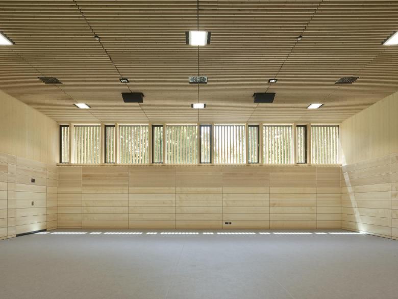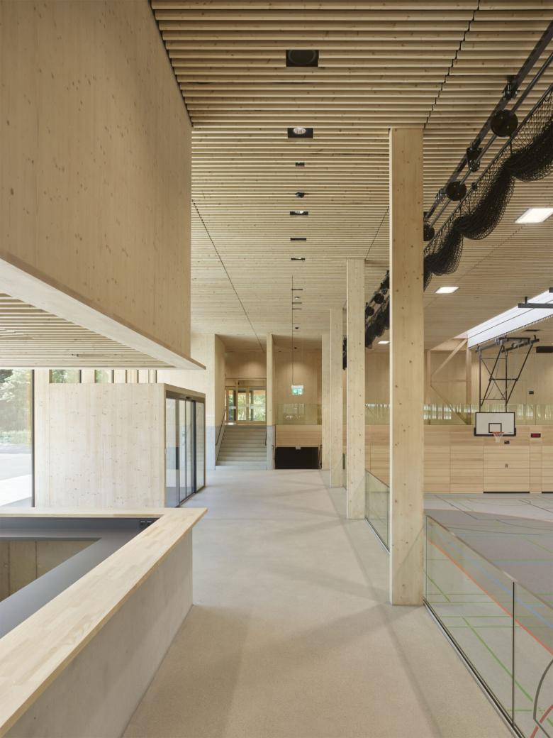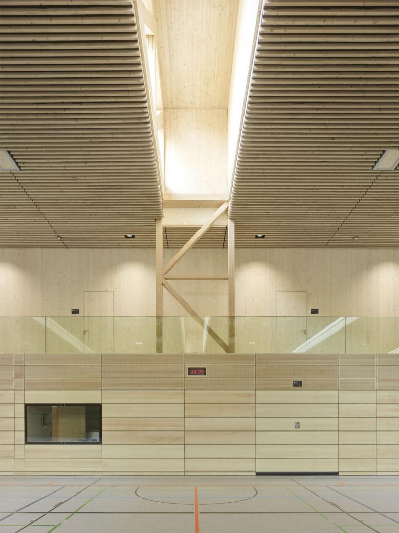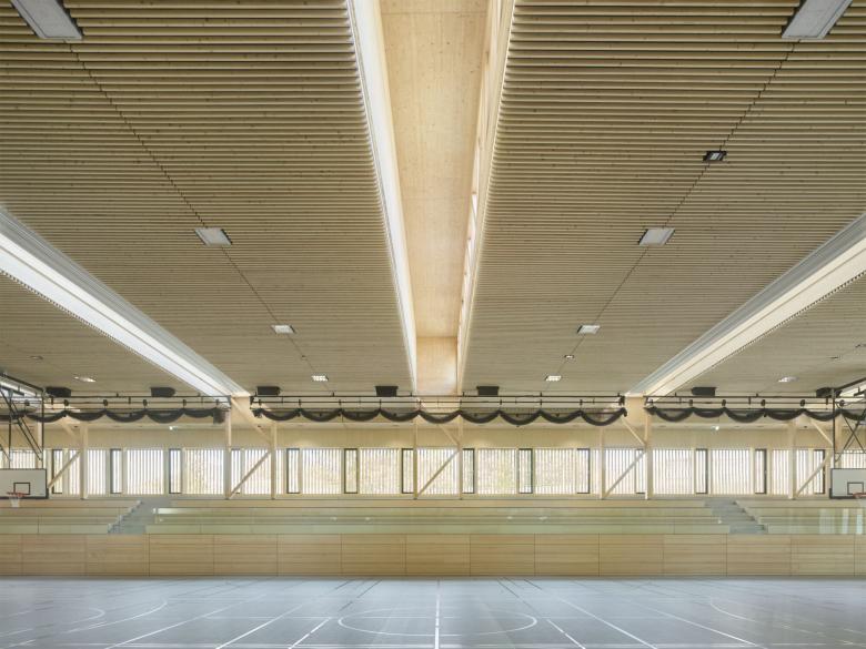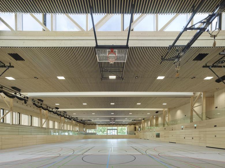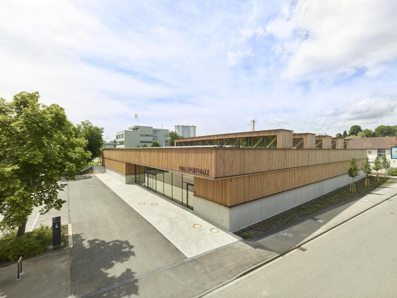 Neubau einer 3-fach Sporthalle mit Gymnastikraum und Werk-Schulräumen an der Adenauerallee in Biberach an der Riß. Der neue Baustein an der Adenauerallee ersetzt die bisherige Sporthalle, der markante Baukörper ist präsent an der Straße und Brücke und bildet zum Parkplatz und Freiraum eine wichtige Raumkante aus. In der Aufsicht von der Brücke erscheint die 5. Fassade gegliedert. Die Erschließungsbereiche sind dem Freiraum zugewandt und wirken einladend zum öffentlichen Raum, zur Schule hin streckt sich die überdachte Pergola. Der kompakte Baukörper beinhaltet ablesbar die Nutzungsbereiche Sporthalle mit Nebenräumen, die Gymnastikhalle, Zuschauereinrichtungen und die Werkräume der Gemeinschaftsschule.