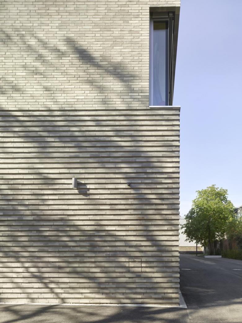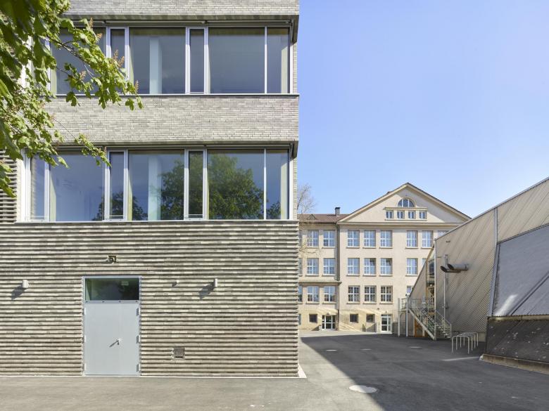 Hinter dem bestehenden 1912 von Richard Dollinger erbauten Schulgebäude des Zeppelin- Gymnasiums entsteht auf dem Schulhof ein dreigeschossiger Neubau mit Mensa, Klassentrakt und Arbeitsräumen als Erweiterung des bestehenden Schulbaus. Das Gebäude befindet sich zwischen Hauptgebäude, Sporthalle und der benachbarten Entsorgungsunternehmen der Stadt Stuttgart und fügt sich maßstäblich in den Baumbestand ein. Der Neubau zeigt sich als klarer, länglicher Baukörper, der sich sowohl mit seinem symmetrischen Aufbau, als auch durch Materialität und Farbigkeit auf das historistische Schulgebäude bezieht.
