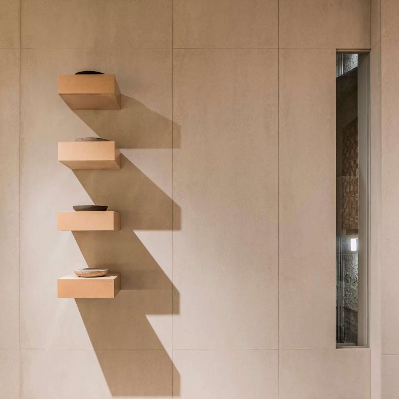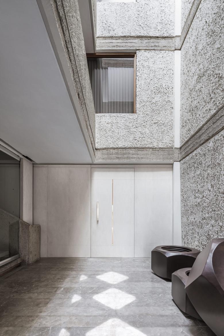La experiencia que promueve la serenidad creativa inicia desde el puente de ingreso, un pasillo de 15 metros de largo, suspendido entre muros de concreto, rudamente terminados, que tienen como remate la puerta de la galería. El patio, al final del pasillo, funciona como un reloj de sol que marca el inicio del verano por medio de la Luz que se filtra hacia el vestíbulo de la triple altura y que coincide con la ranura de la puerta de ingreso los días 21 de junio. La secuencia continúa a través de una galería de arte que vestibula el ingreso a través de la exhibición de piezas que nos remiten a los orígenes de las formas y los espacios, los colores y las texturas. Este es el umbral que nos invita a la reflexión y que nos prepara para el proceso creativo al que estaremos sujetos durante nuestra estancia.