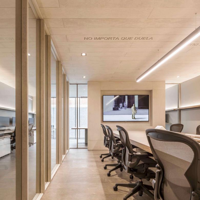 El centro del estudio es la sala de juntas; un lugar monocromático, entre muros y cristales, entre duelas de piedra y de fibrocemento, que moduladas con precisión inmejorable, nos harán sentir envueltos en una atmósfera relajada y armónica, donde cada parte, por pequeña que sea, está entretejida con el todo.
